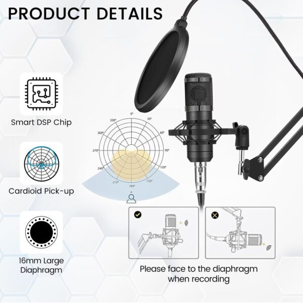 【Studio-Grade Sound Quality】This podcast bundle features Smart Noise Reduction System and 360° omnidirectional capture technology for vocal precision. Dual-layer defense: Outer metal mesh filters plosive sounds, while inner windproof foam eliminates ambient noise. Integrated with professional DSP audio processing chip, it delivers studio-quality sound with real-time optimization.