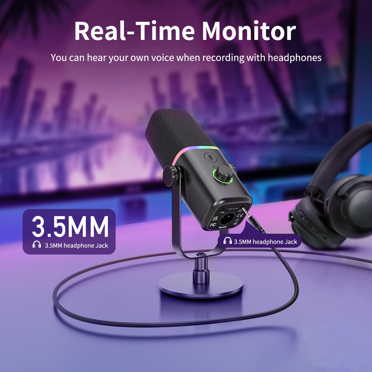 - [More Function Keys]This podcast microphone is equipped with a versatile two-in-one volume knob. Simply touch and hold the mute button to For Switch between monitor mode and mic volume adjustment. The volume knob turns green for mic volume control and blue for monitor volume control.This intuitive design offers ease of use and a clean, professional look—perfect for content creators who need efficient audio management. The built-in 3.5mm headphone jack enhances your experience.