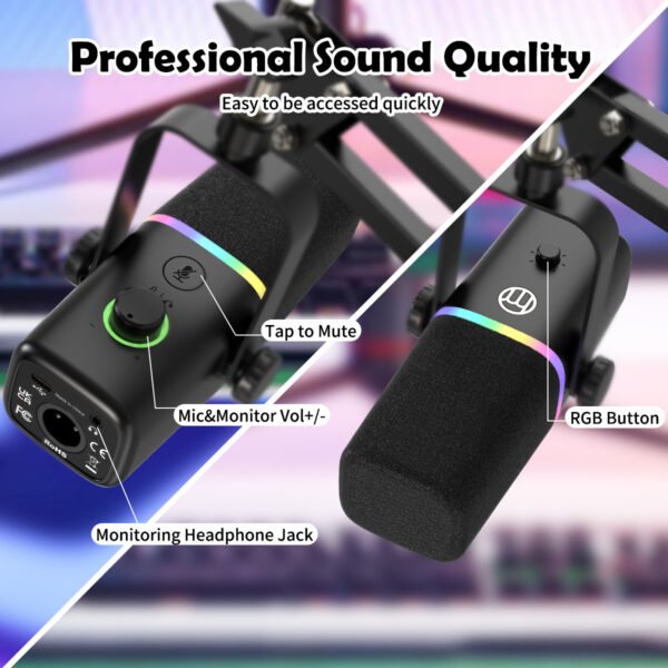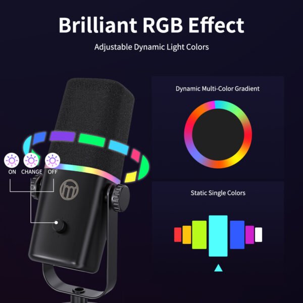 - [Controllable Brilliant RGB Light]The gaming microphone for computer enhances your gaming setup with customizable RGB lighting, creating a visually stunning experience. It features an RGB ring with 4 modes and over 20 colors, allowing you to easily adjust the lighting using the mic’s button while gaming or streaming. Simply press and hold the RGB button to For Switch colors or click to toggle the RGB effect.