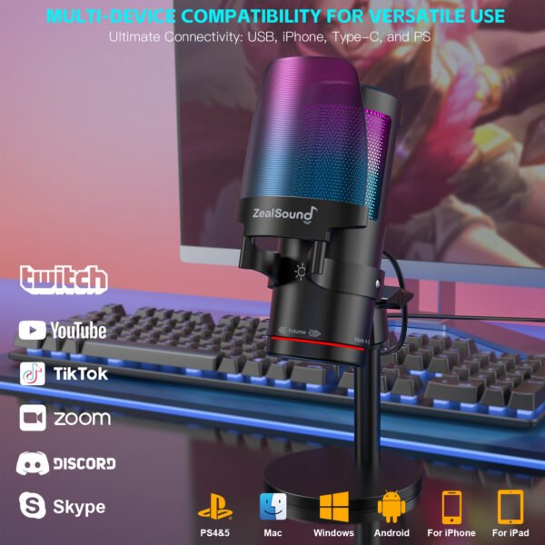 ZealSound Gaming USB Microphone KM8,Noise Cancellation Condenser mic with RGB Light,Touch Mute,Gain