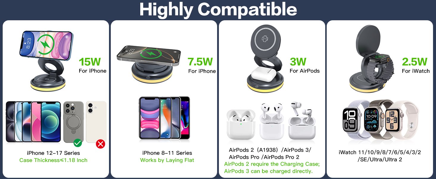 Power up your iPhone, Apple Watch, and AirPods all at once. Compatible with iPhone 12–16 (Magnetic), iPhone 8–11, select Android phones, and all Apple Watch & AirPods models. Perfect for home or travel.