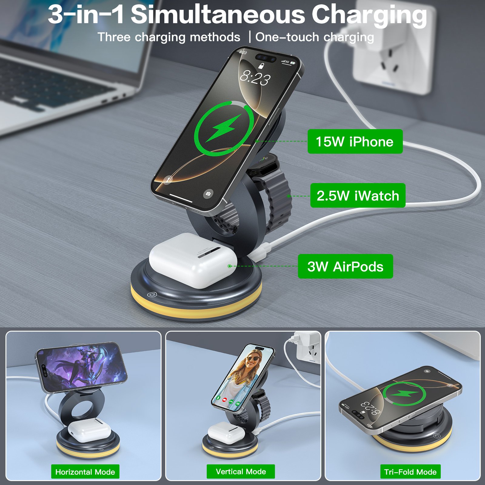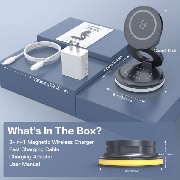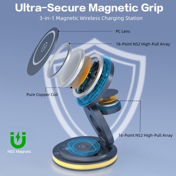 Foldable 3-in-1 magnetic charger designed for modern living — featuring triple coils for faster charging, strong N52 magnets for precise alignment, and 90° adjustable viewing for total convenience. Built for power, precision, and portability — wherever life takes you.