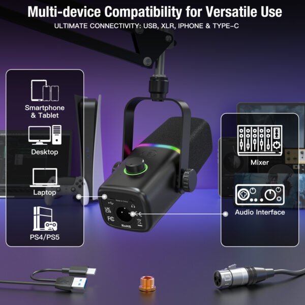 Includes a USB adapter for iPhone and iPad Pro (iPhone 5 and newer) and a Type-C adapter compatible with all Type-C devices, including iPhone 15 and 16. Works with PS4, PS4 Pro, PS5, desktop computers, laptops, and audio mixers. Features both a Type-C and 3-pin XLR jack for USB and XLR connections.