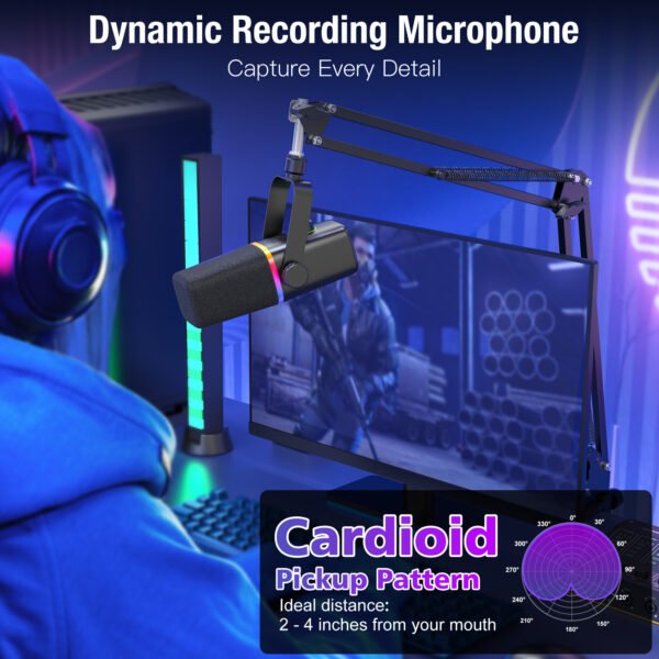 Dynamic microphones are ideal for gaming, live performances, and untreated environments due to their durability and noise rejection. Start creating content instantly for YouTube, Instagram, Zoom, TikTok, Twitch, podcasts, recordings, gaming, and ASMR with this dynamic microphone.